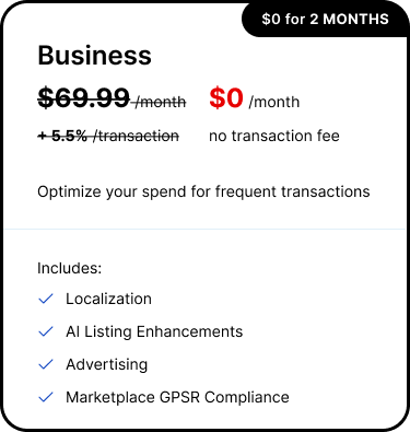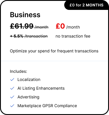 The free trial period lasts for 30 days and includes limited access to Internationalization (listing localization on 6 international markets). Upgrading to a full plan provides access to the full version of Internationalization (11 international markets) and Advertising (Promoted Listings with general and priority campaign strategies).