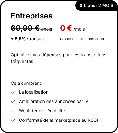 Grâce au partenariat de Webinterpret avec eBay, les frais d’insertion sont gratuits pour les annonces internationales (dans les marchés éligibles). Vous pouvez également accéder à la gamme complète de produits eBay de Webinterpret pour augmenter vos ventes nationales et internationales, qui comprennent les services Publicité (Annonces sponsorisées avec stratégies de campagne générale et prioritaire), Retours et Conformité au RSGP.