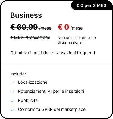 Grazie alla partnership di Webinterpret con eBay, la pubblicazione delle inserzioni internazionali è gratuita (se avviene sui mercati idonei). Puoi anche accedere al pacchetto completo di prodotti eBay di Webinterpret per incrementare le tue vendite nazionali e internazionali, che includono i servizi di Pubblicità (Inserzioni Sponsorizzate con strategia generale e prioritaria per le campagne), Resi e Conformità al GPSR.