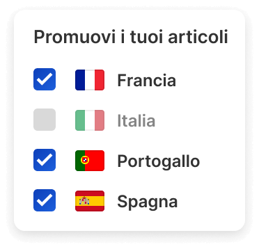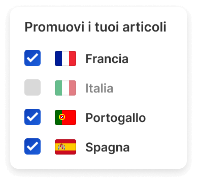 i tuoi articoli su 11 mercati internazionali Le tue inserzioni originali vengono tradotte e localizzate automaticamente grazie al modello di elaborazione del linguaggio naturale di Webinterpret. Promuovi le tue nuove inserzioni internazionali con le Inserzioni Sponsorizzate (strategia generale e prioritaria per le campagne) per ottenere la massima portata e visibilità su 11 mercati internazionali.